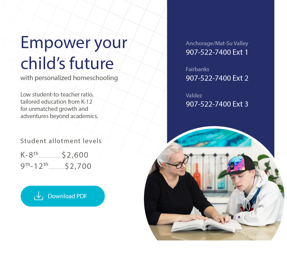 The State of Alaska is unique in that it offers full school choice to homeschooling families, by financially supplementing, supporting and assessing remote student education.  Homeschool programs through public school districts empower families to educate and develop each of their students to their full potential, by treating each as an individual and tailoring their education to the learning style that best suits them.